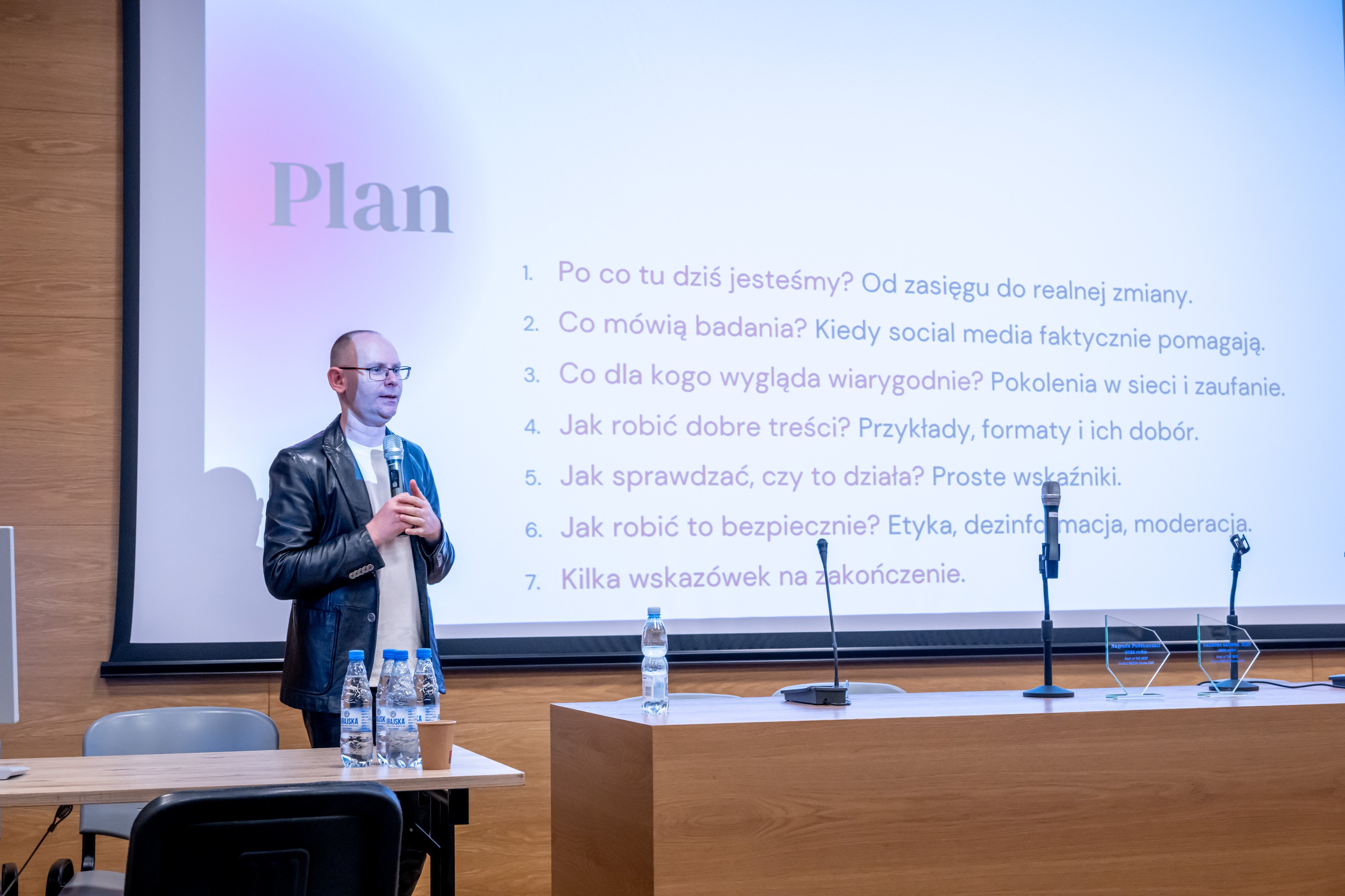 Podczas swojego wystąpienia podał m.in. przyczyny nieskutecznej komunikacji, scharakteryzował użytkowników mediów społecznościowych oraz przeanalizował strategię tworzenia treści w Social Mediach.